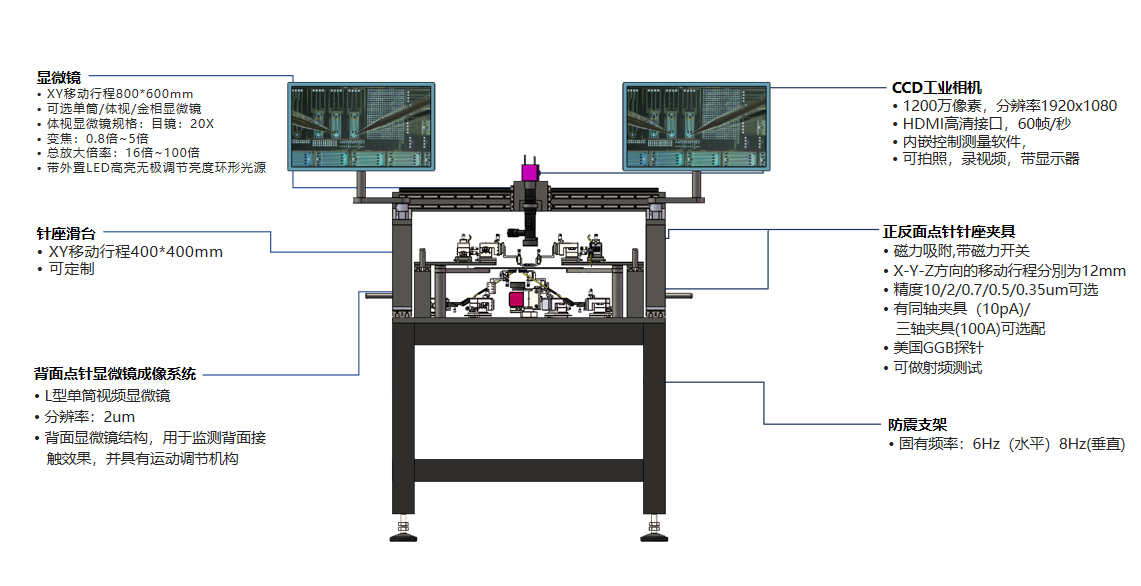 双面探针台是专为在大面积PCB (印制电路板)上精确表征射频参数的专业工装设备,用于需要正面和背面同时扎针,以实现各种光/电性能测试需求的测试设备。系统包含高稳定性台体、大范围探针座(射频探针定位器)移动平台、专用校准卡盘、易操作的PCB夹持器、高稳定性双CCD成像系统组成;选件丰富,支持带theta 调节的定位器基座,支持扩频到110GHz。